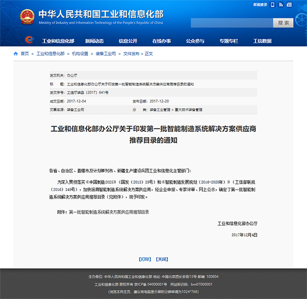 2017年12月20日,工信部正式發(fā)布了關(guān)于印發(fā)第一批智能制造系統(tǒng)解決方案供應(yīng)商推薦目錄的通知,為深入貫徹落實(shí)《中國制造2025》和《智能制造發(fā)展規(guī)劃(2016-2020年)》,加快培育智能制造系統(tǒng)解決方案供應(yīng)商,經(jīng)企業(yè)申報(bào)、專家評...